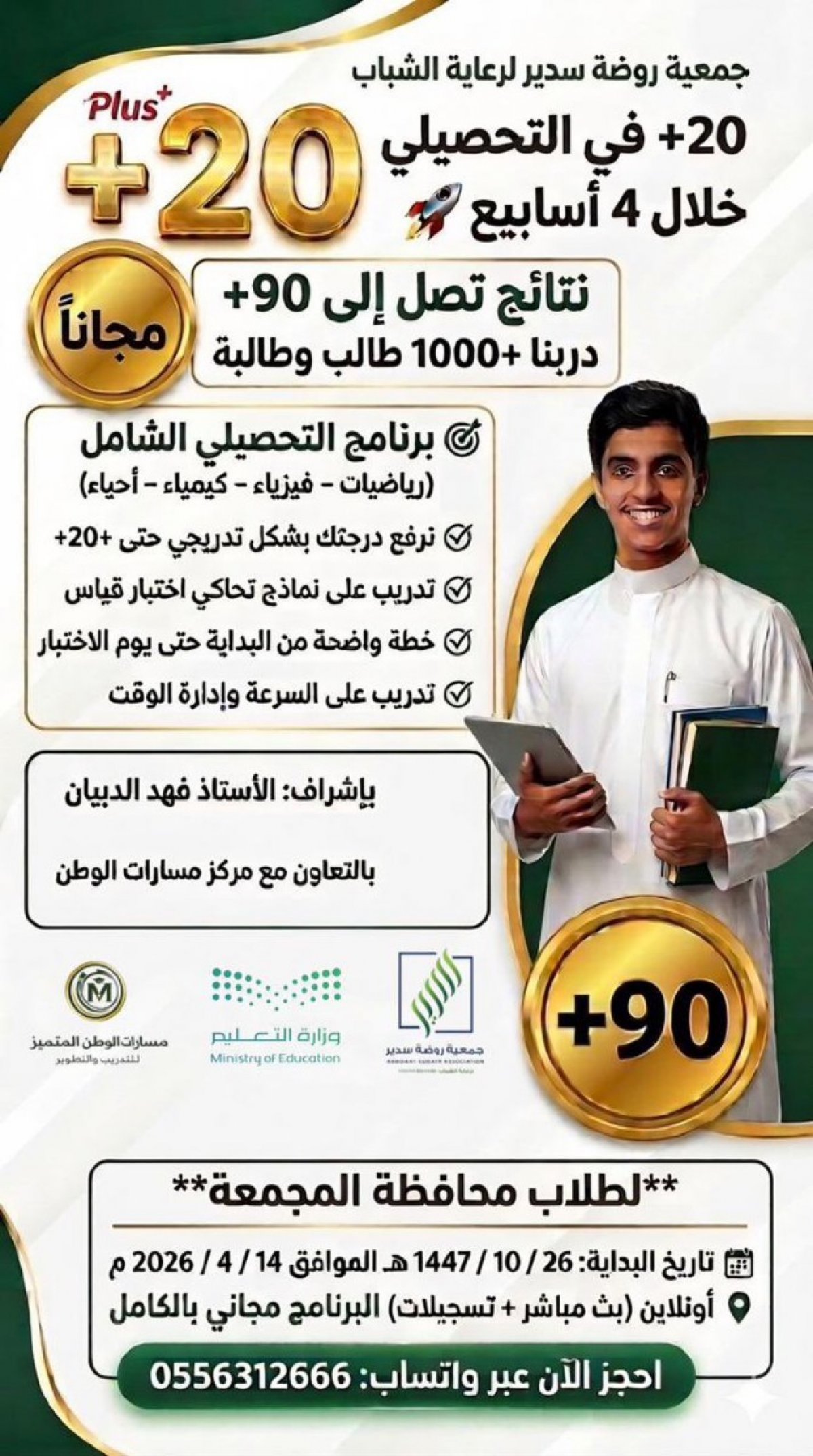 ارفع درجتك في التحصيلي خلال 4 أسابيع، برنامج التحصيلي الشامل (رياضيات – فيزياء – كيمياء – أحياء) بإشراف الأستاذ فهد الدبيان ومجاني لطلاب محافظة المجمعة البداية: 14 أبريل 2026 الحجز عبر واتساب: 0556312666